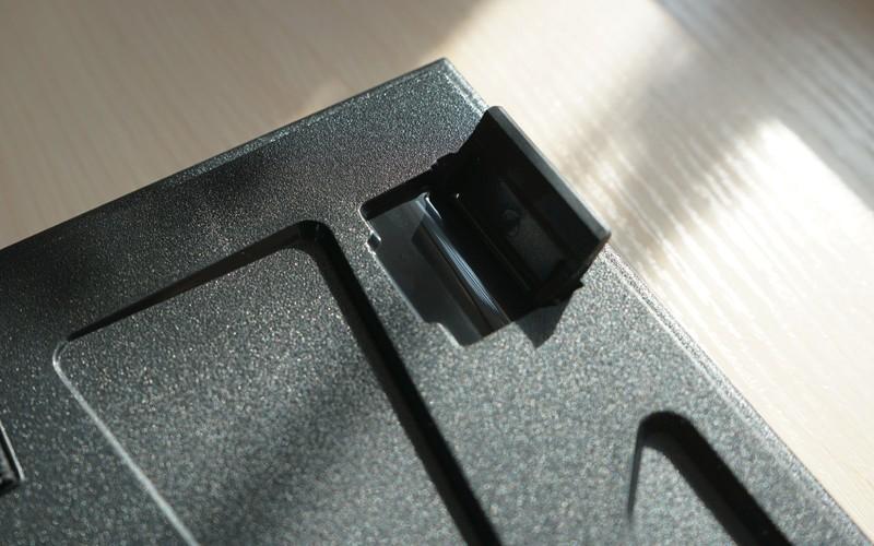 值得一提的是键盘背面设计了 4 个出水孔,为防水做了一定处理,同时中间设计有高端机械键盘才有的耳机固线槽位。