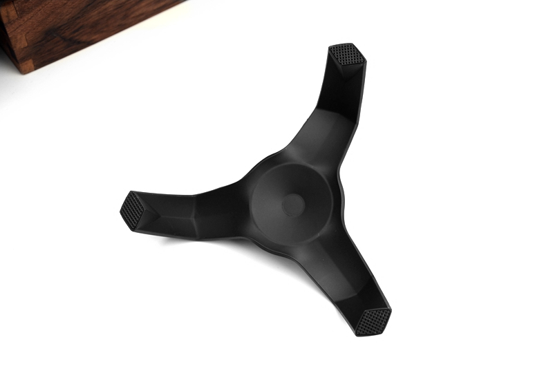 金属三脚支架,造型有点像鼠标线夹,细节处理地挺到位,底部进行了防滑处理。