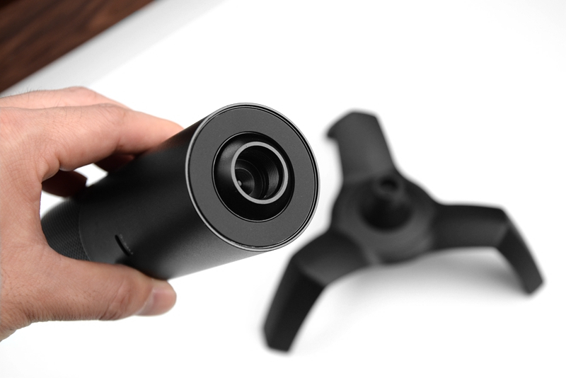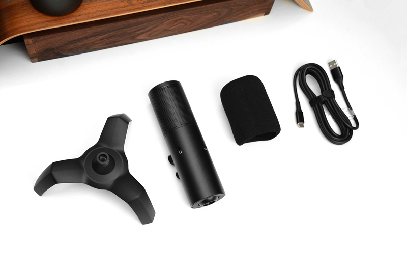 其实出厂时,麦克风是已经安装在支架上的,插上数据线就能使用。底部三脚支架采用万向轴设计,可360°旋转,内置了减震架。