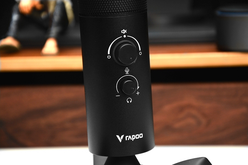 麦克风的操作区,底部是雷柏LOGO,最上方是拾音模式开关,下方是耳机音量开关。