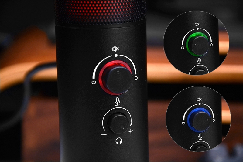 连接电脑后,麦克风氛围灯和指示灯都亮起。拾音模式开关,往左是心形模式,绿色灯光,只拾取麦克风对面的声音;往右是全指向模式,蓝色灯光,360°拾取声音;中间则是静音模式,红色灯光。这里提个小建议,一般来说,都是在比较急促的情况下才选择静音,个人觉得按钮比旋钮更迅速一些。