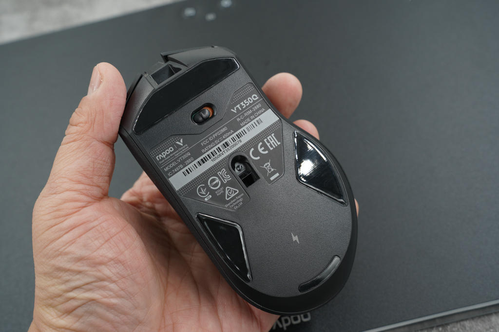 以前觉得雷柏的鼠标底盘设计挺随意的,这款雷柏VT350Q进步了许多,贴纸的设计,包括脚垫,都讲究了许多。看到那个带有雷电LOGO的地方了么,这里是无线充电区域。