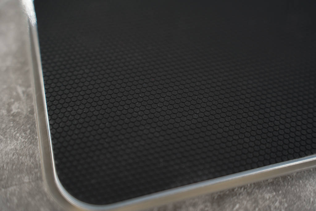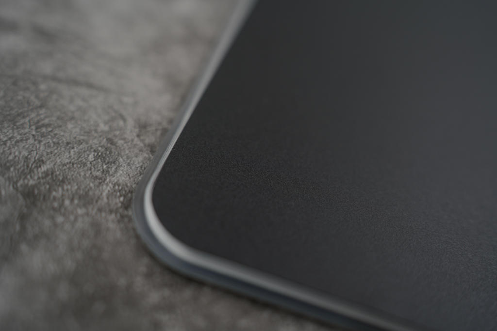 这块垫子很大,表面看起来是磨砂质感,但实际上很光滑。它是一块(PC+PS+硅胶)硬垫子,现在也有一些是软质布面的,这个就看个人需求了。