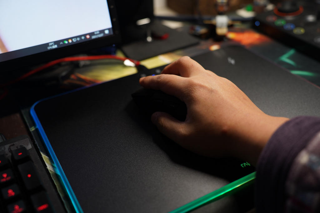 这套设备刚拿到手,就玩儿了几把我最爱的《英雄联盟》,由于本人之前一直用的是布面软垫,所以还是花了不少时间适应了一下。雷柏V10RGB鼠标垫的表面材质非常光滑,是一款典型的速度型鼠标垫,不管啥鼠标放在上面,滑动的时候都是相当光滑和快速的,说它像“溜冰”可能有点夸张,但也差不了多少哈!所以像我这种从高阻尼布垫子转过来的人,对于手腕的精准控制还是十分关键。上手了几把英雄联盟后,这种畅快淋漓的速度感一下子就拿捏得八九不离十了。雷柏VT350Q的手感也还不错,我这个人对于鼠标手感的敏感度很低,基本上只要不是那种便携式的笔记本鼠标,大多数正常鼠标我都能很快上手,长时间使用下来,我脑子里完全没把它当做一个无线鼠标来看待,延迟、定位都很强,没毛病!
