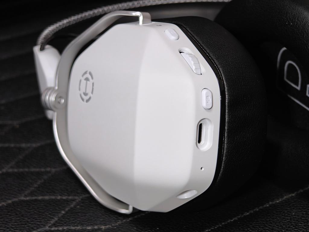 耳机操控区设置在左单元下方,功能非常丰富,包括:耳机状态灯、开关/模式切换G键、音量调节滚轮、麦克风开关键、Type-C充电口、内置麦克风孔以及外置麦克风连接孔;