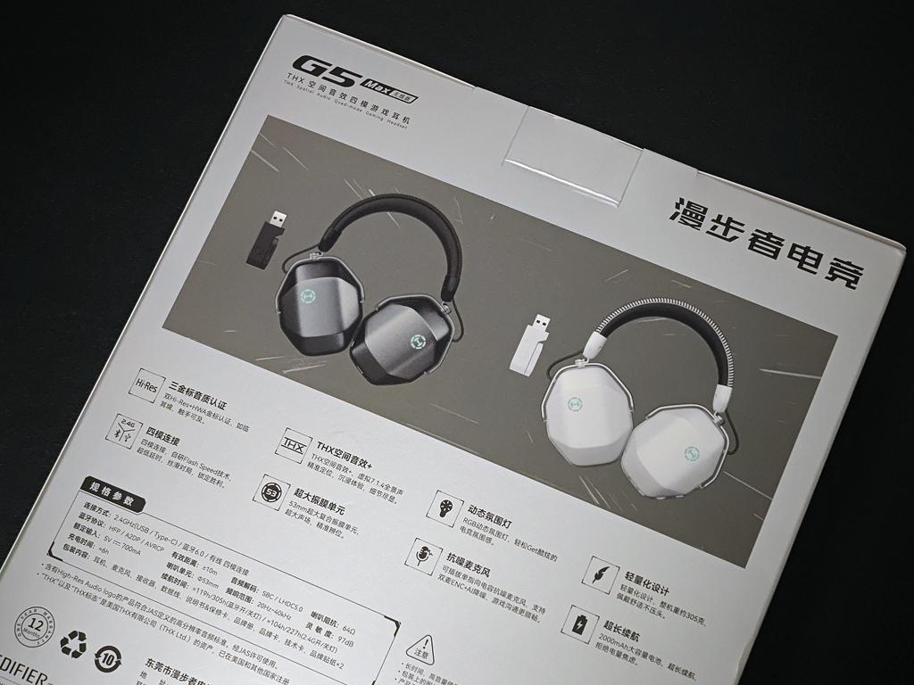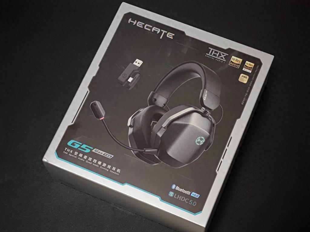 Hecate G5Max无线耳机采用银黑色纸盒包装,包装正面印有这款耳机的外观、名称、型号、以及THX空间音箱、四模、三金标认证、蓝牙6.0、LHDC5.0等字样。这款耳机采用四模连接,支持台式机、笔记本、PS主机、手机、SWITCH等多平台使用;