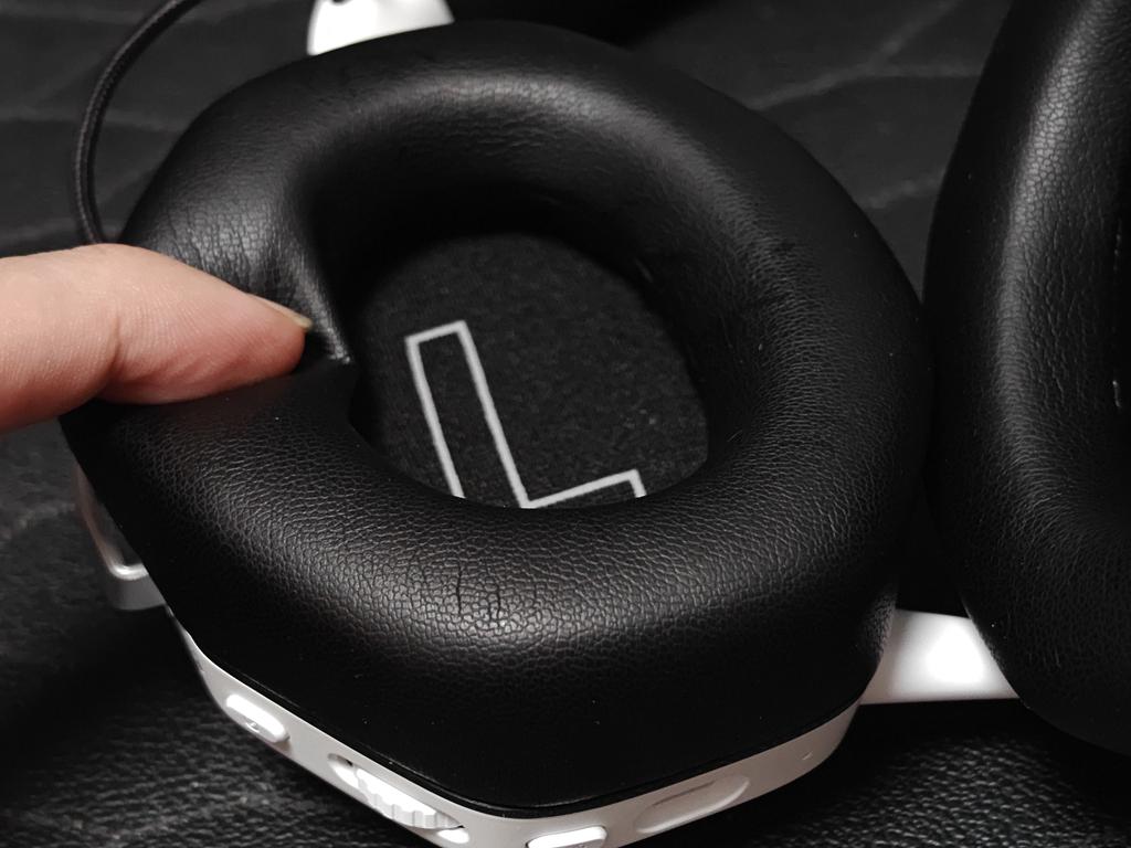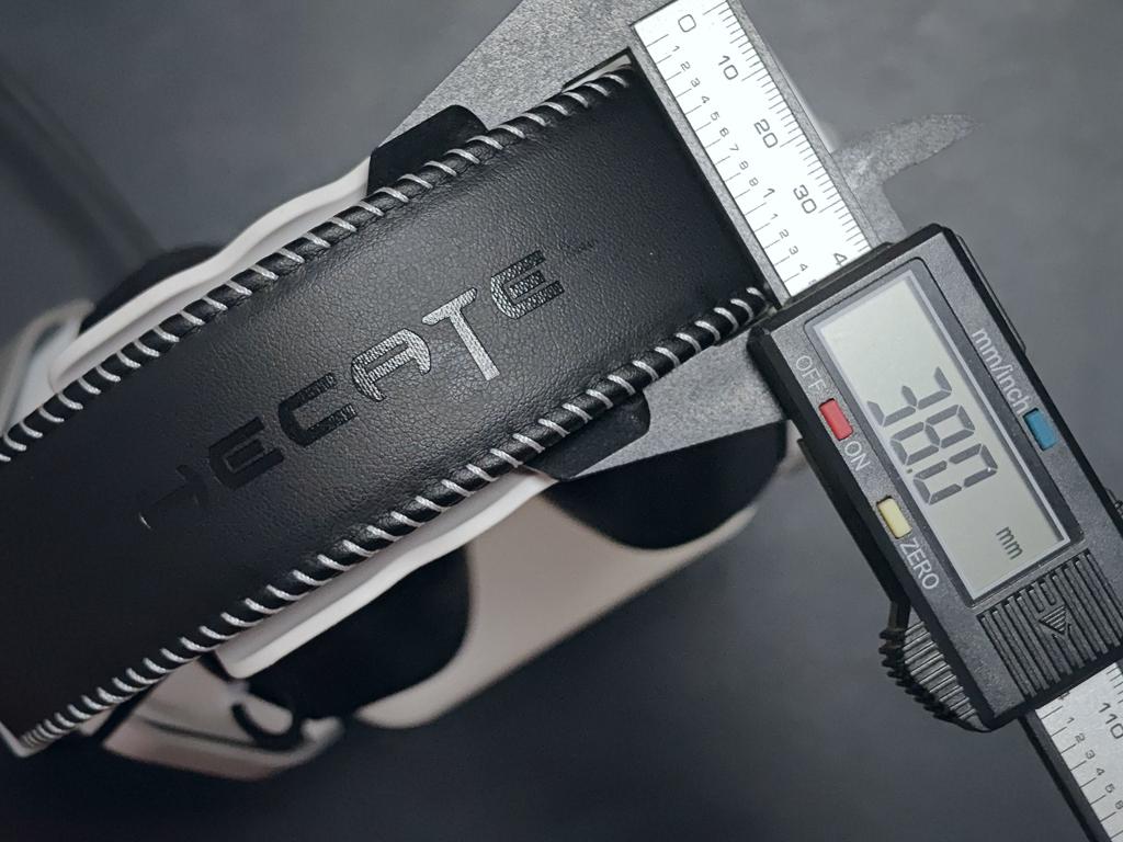 与头部接触的记忆棉质地柔软,舒适不压头,外层黑色的蛋白皮也不容易脏。实测头梁宽度约38mm,这样的宽头梁设计可以让玩家戴起来更舒适,很好的分散佩戴压力,长时间佩戴也没有压力;