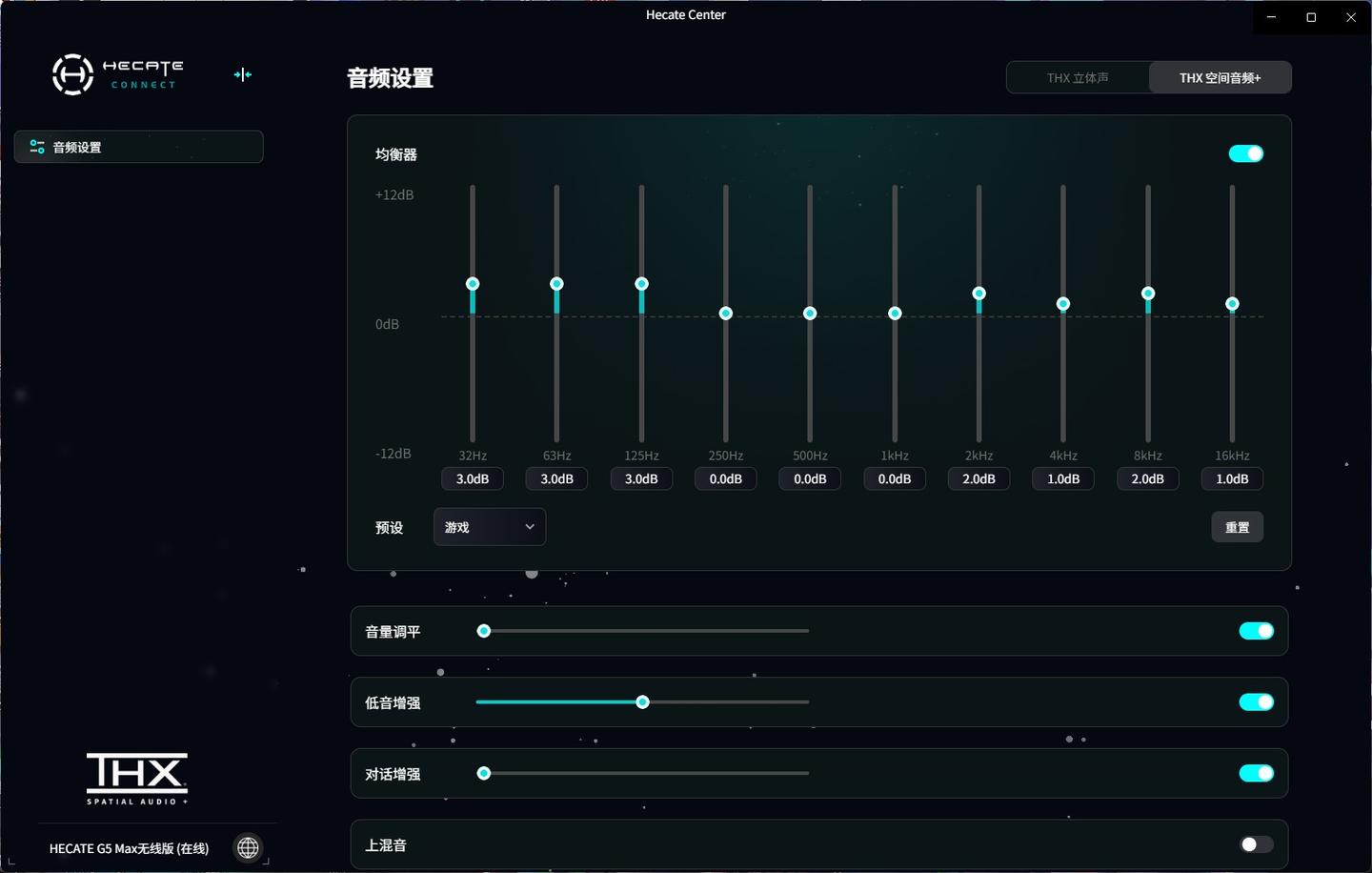 HECATE G5Max支持THX立体声和THX空间音频+,从官网下载HECATE Connect即可设置,均衡器内置电影、游戏、音乐等多种音效,也可进行自定义音效。