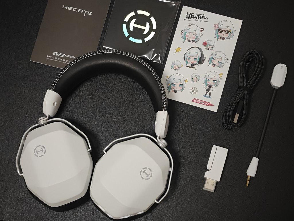产品的配件很丰富,包括:HECATE G5Max无线耳机、可拆卸耳麦、2.4G无线接收器、USB-A to C数据线、卡通贴纸、说明书和保修卡