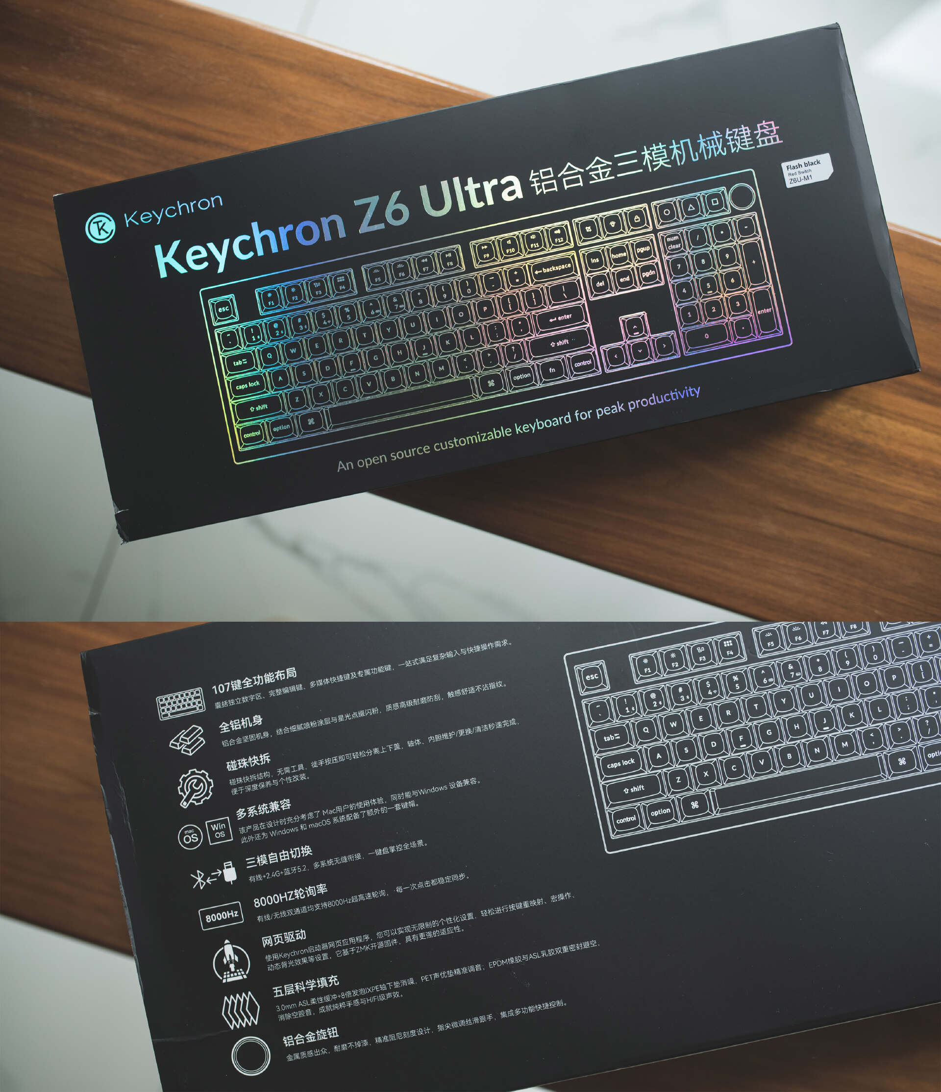 高颜有深度,实用主义也有硬核即便是全新系列,Z6 Ultra依旧秉承Keychron传统线稿的包装设计。内部保护得当,配件丰富,沿袭客制化基因的产品设计思路。