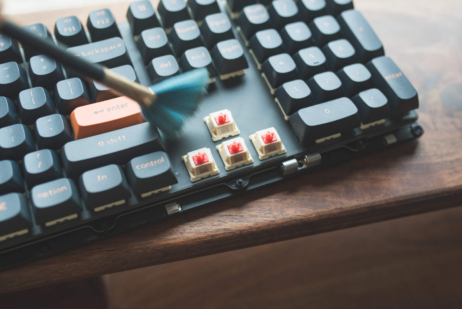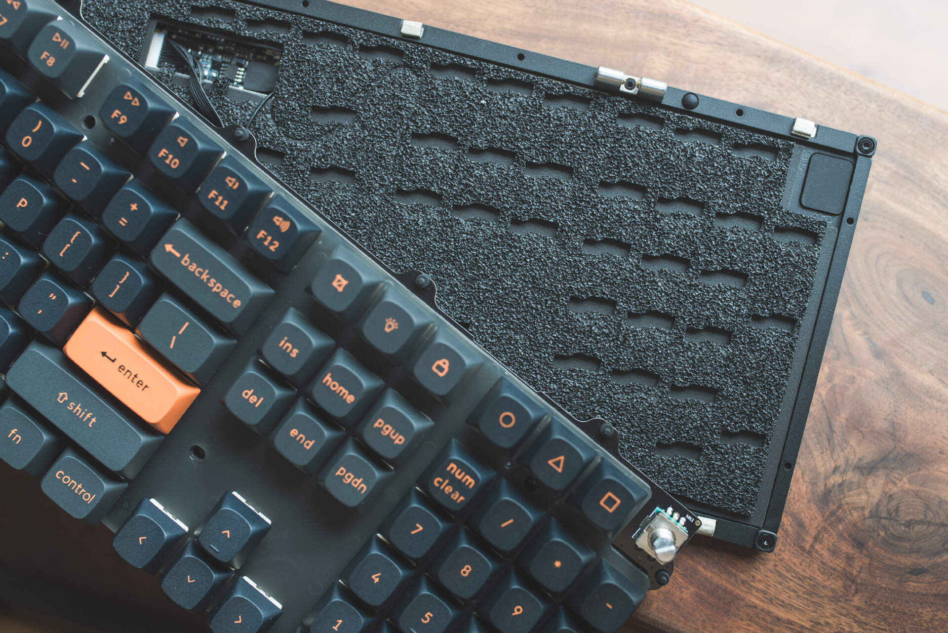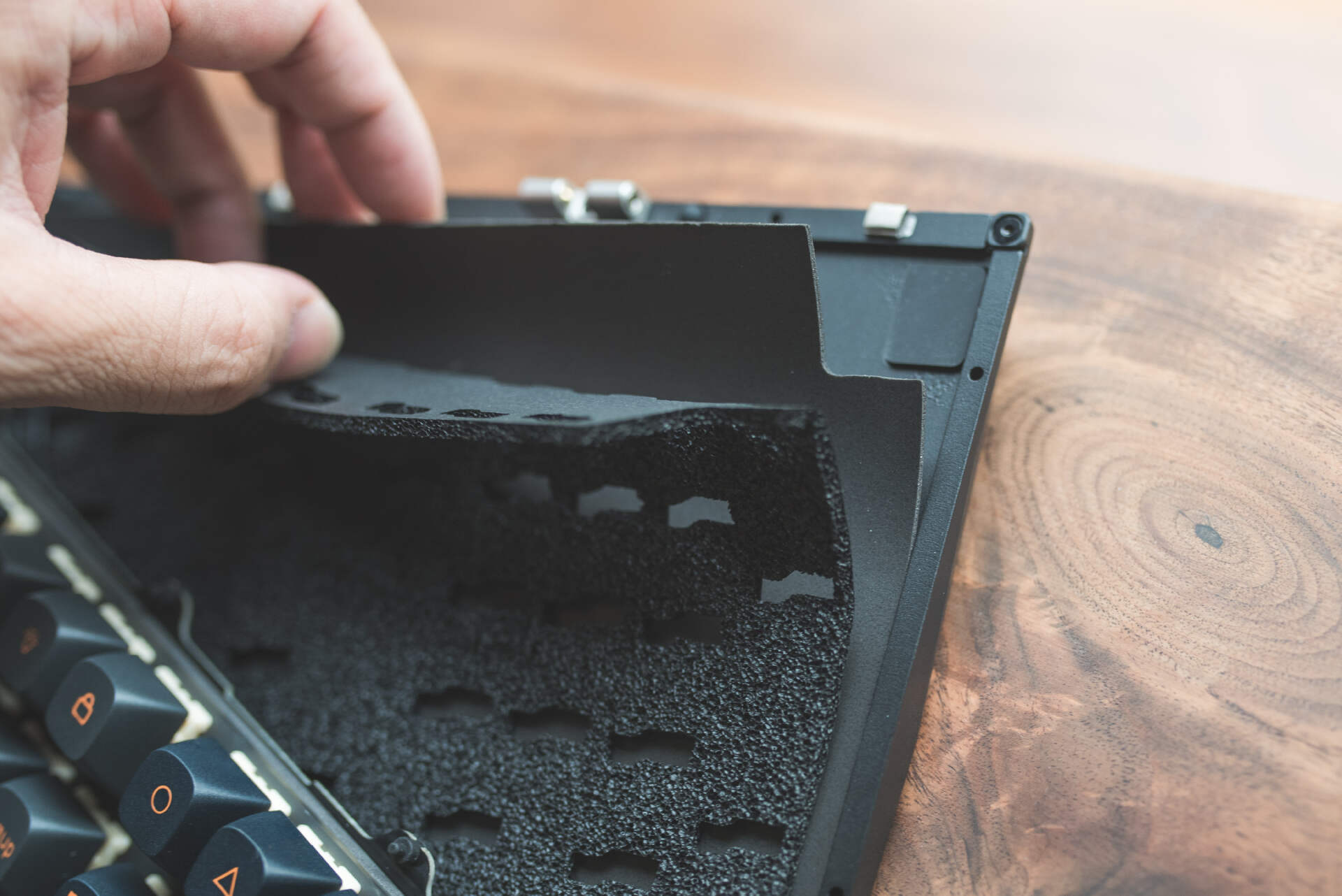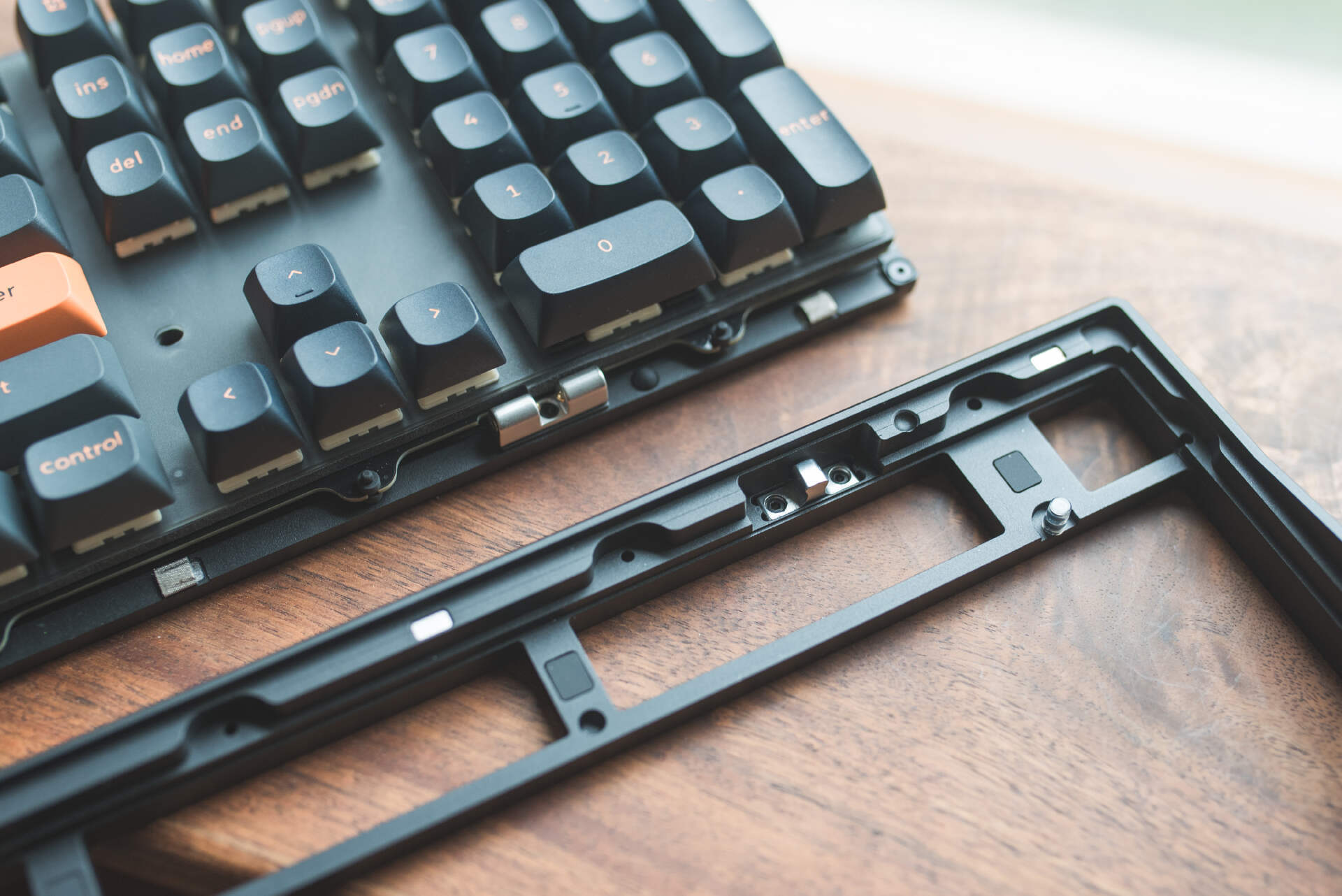 近半年多非常流行的碰珠快拆终于也是用上了,即便是客制化新手玩家,有了这样的快拆结构,通过巧力开盖,非常轻松的搞定内部改造、更换配件、清灰等操作。当然Keychron对于公差位置和快拆力度把握的很好,即便是从边缘提起键盘也不会跌落。当然我觉得对于铝坨坨键盘而言,碰珠快拆结构是极其必要的,这将大幅避免传统螺丝固定对金属部件的磨损,让产品使用寿命不再成为玩家的烦恼。
