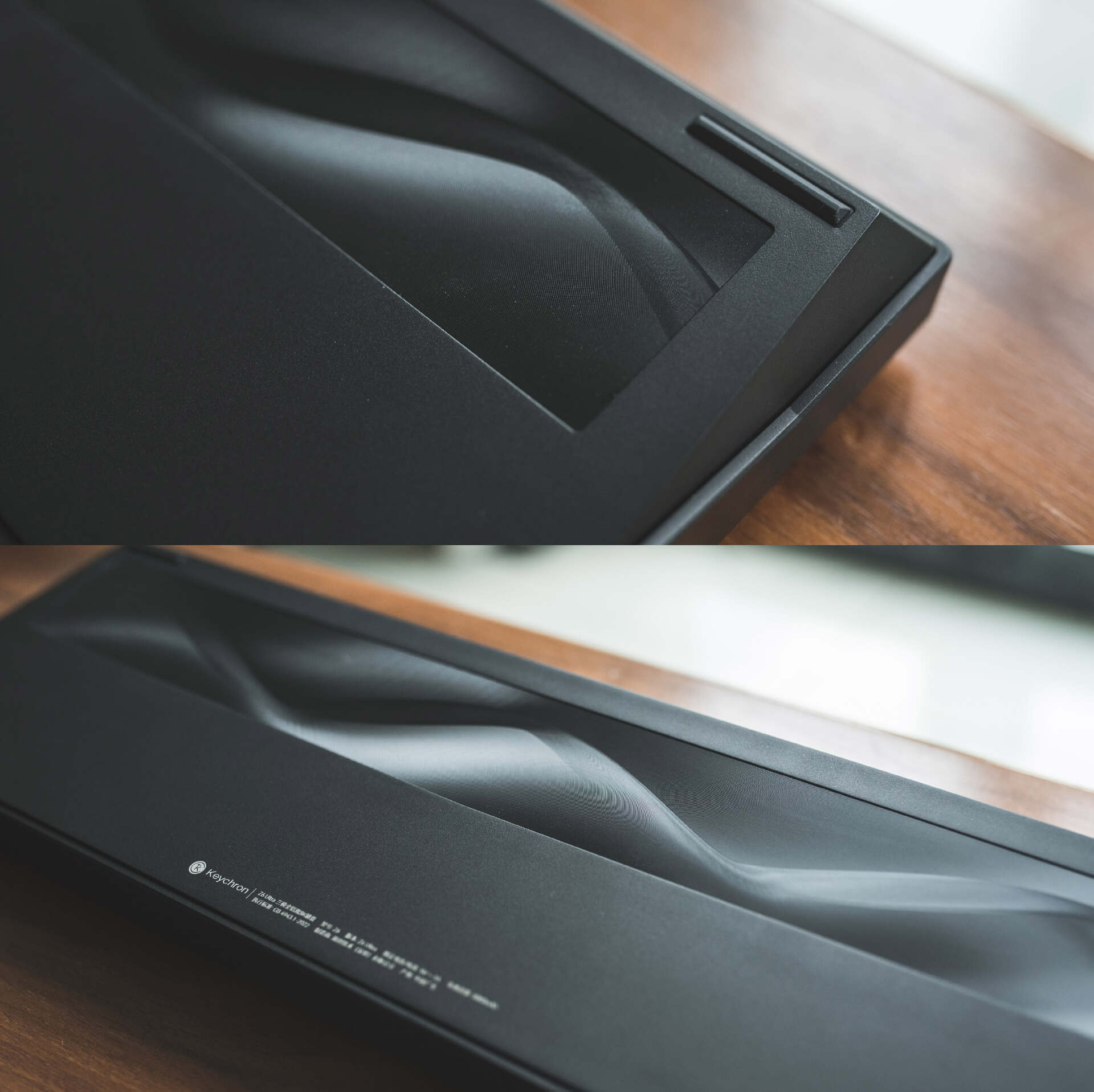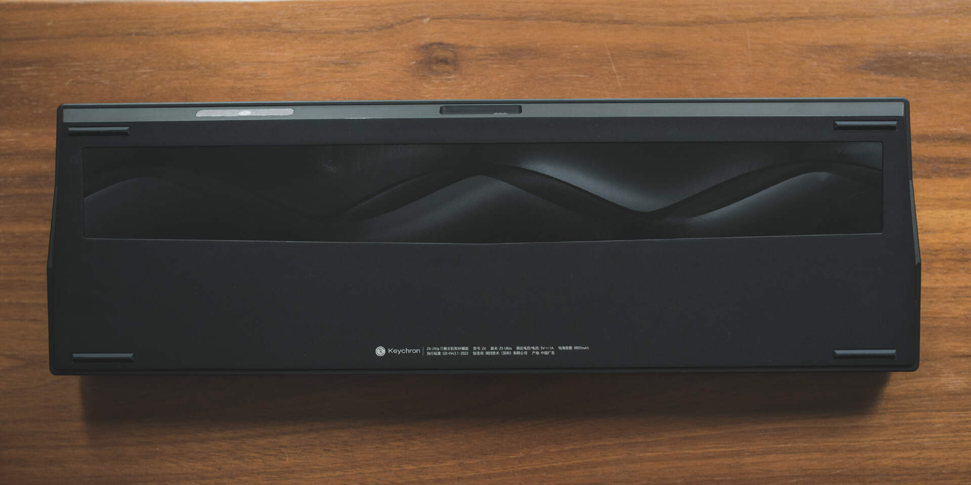 铝坨坨键盘往往主打就卖个材质,能把倒角和表面涂层做好就不错了,而Keychron偏要秀一下肌肉。如果说正面的全配列布局有点过于传统,那么Z6 Ultra背面的刀纹背板设计显然是产品美学追求的另一种写照。在不同角度或光照下,背板会呈现出丰富的光影变化,使得让键盘背面也能成为一道风景线。