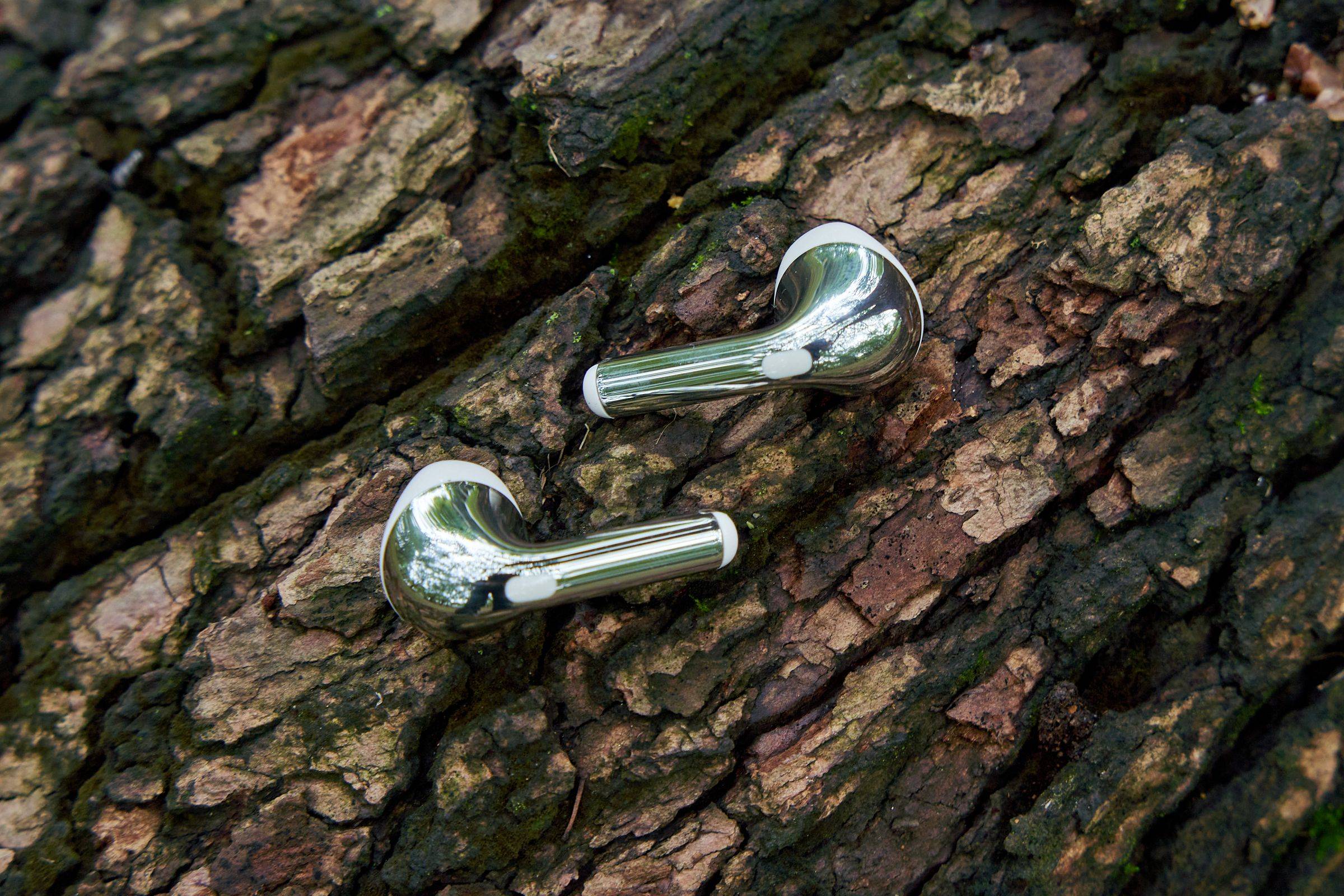 充电仓一半电镀一半皮纹,两种风格相撞竟然意外的精致和谐。上盖开盖不滑手,下盖持握手感温润,整机不易沾染指纹。整体设计圆润小巧,夏天轻薄衣物一样随手揣兜。