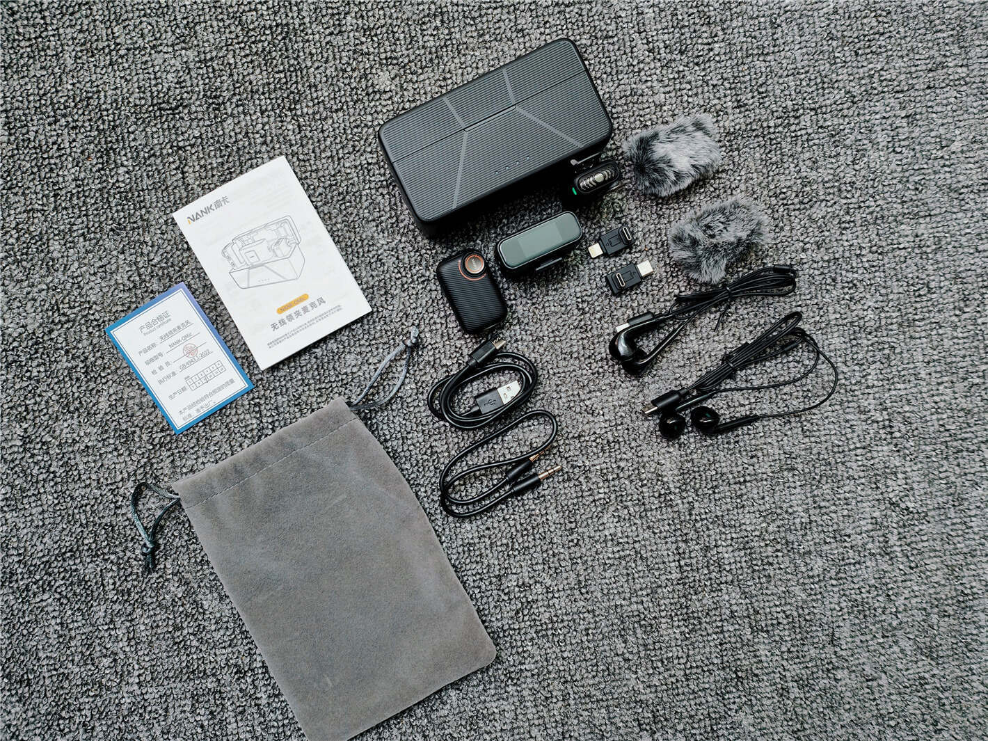 打开包装后,配件令人惊喜,配备了丰富的附件,确保用户可以快速上手并满足各种需求。除了常见的Lightning转Type-C、双Type-C转接头外,南卡Qmic还赠送了两条有线耳机、一条3.5mm音频连接线、两只毛绒防风罩和一个收纳袋。无论是外出拍摄还是录音工作,都能提供完整的配套支持,避免了后期额外购买配件的麻烦。