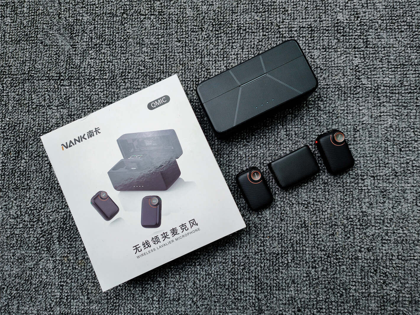 南卡Qmic的外包装简洁而现代,采用白色为底色,正面标注了“NANK南卡”品牌和“无线领夹麦克风”产品名称。包装上还有实物图,清晰展示了黑灰配色的麦克风与充电盒。