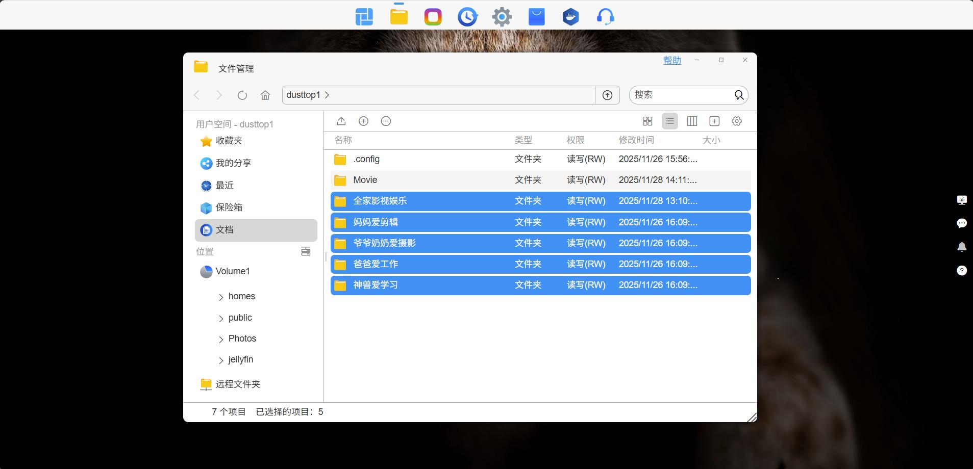 数据文件安全从存储底层构建。孩子的作业区、我的工作区、太太的创作区、公共的家庭影像区和电影库,各自独立,互不干扰。